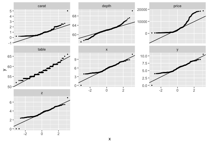 ## View quantile-quantile plot of all continuous variables by feature `cut`