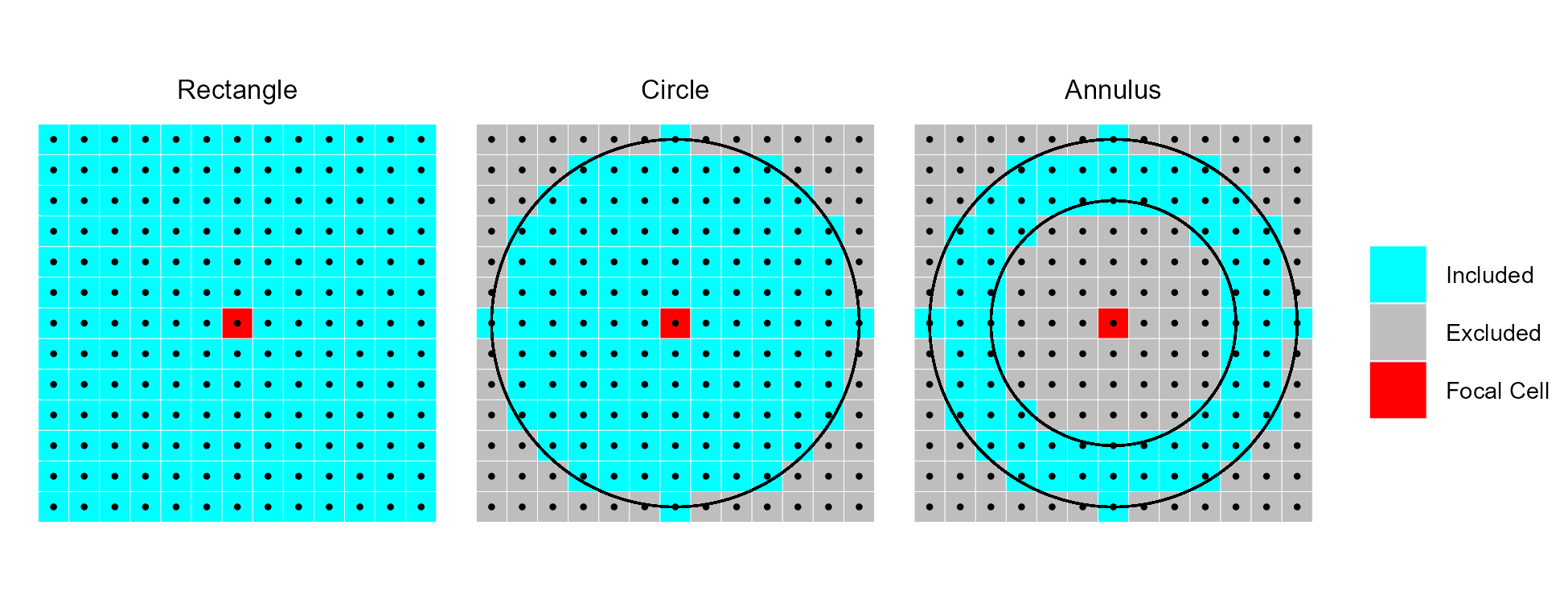 Examples of different focal window shapes. Shown are a 13 x 13 cell rectangular window (left), a circular window with a radius of six cells (center), and an annulus window with an inner radius of four cells and an outer radius of six cells (right).