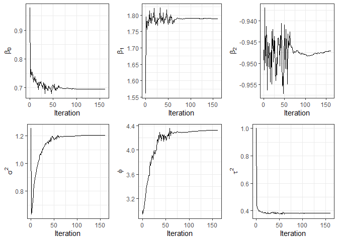 #> beta0 beta1 beta2 sigma2 phi tau2