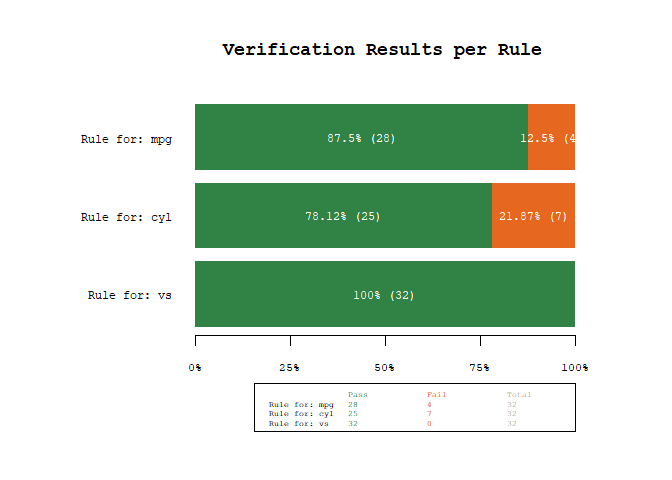 As we can see, our dataset mtcars does not conform to all of our rules. We have four fails (fail=rule is not met) for the first rule mpg > 10 & mpg < 30 (there are mpg values up to 33.9) and seven fails for the second rule cyl %in% c(4, 8) (there are cyl values of 6), while the third rule vs %in% c(0, 1) is always met.