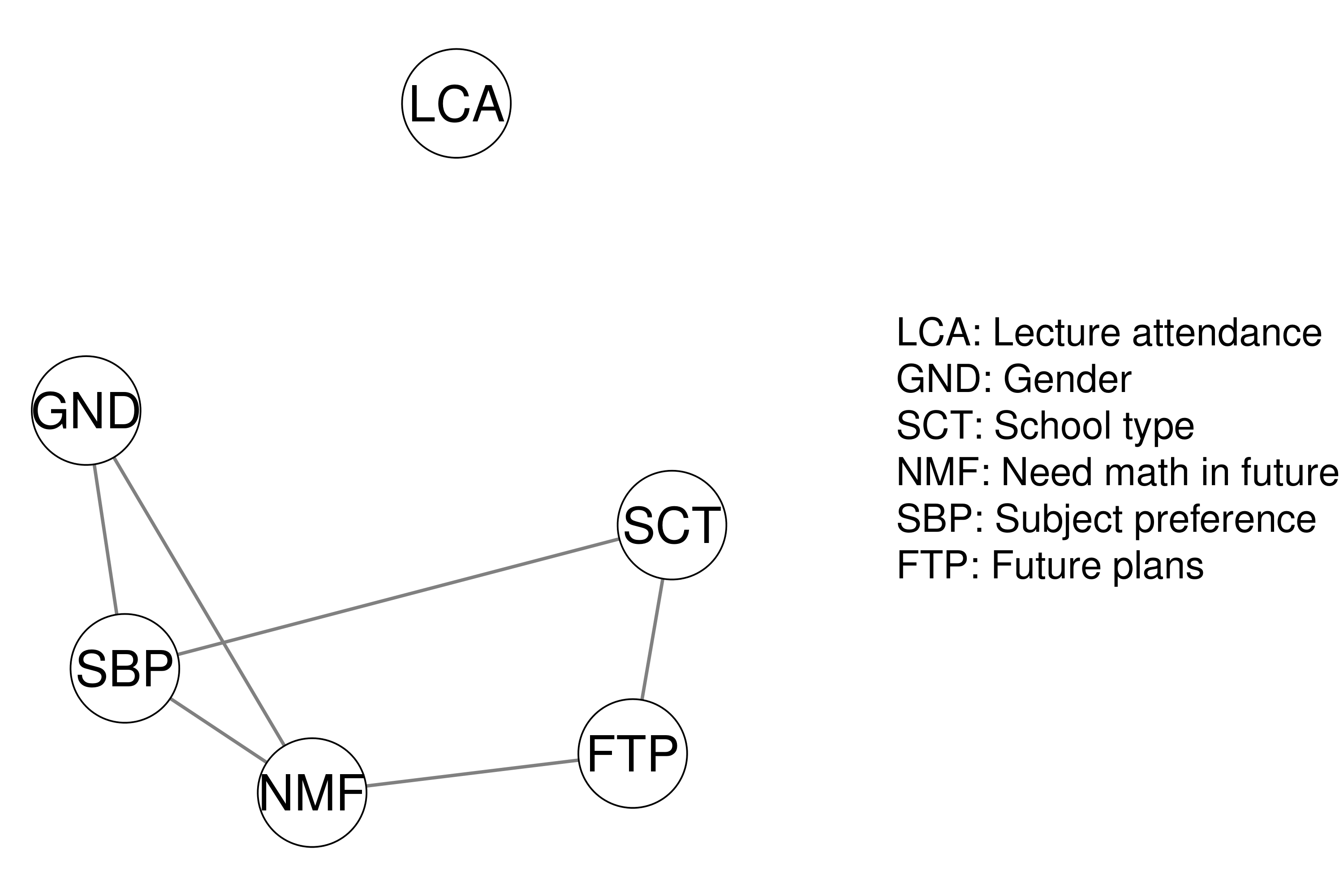 We want to illustrate the package use with an example. In particular, we use the women and mathematics data which can be loaded with the package BGGM. We fit the model and extract its results with the function easybgm. We specify the data and the data type, which in this case is binary.