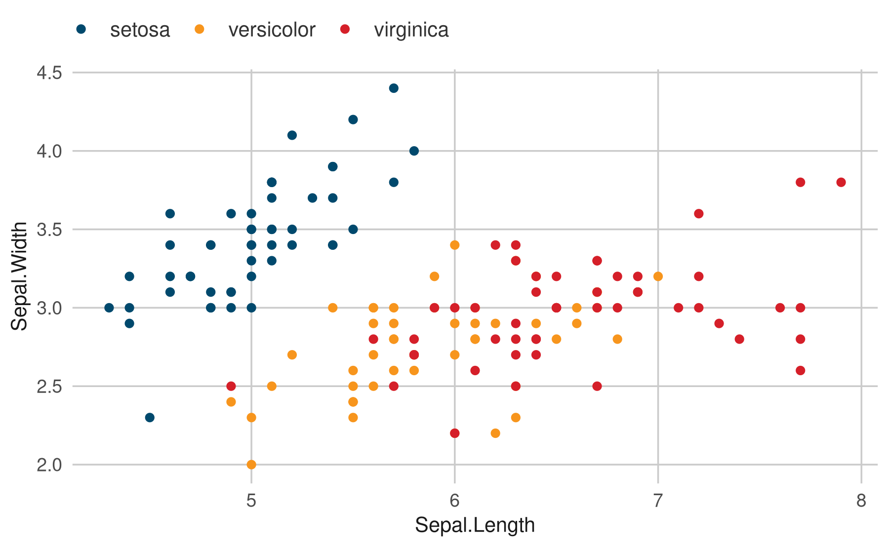 x = Sepal.Length, y = Sepal.Width, color = Species