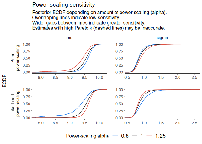 Power-scaling sensitivity analysis and priorsense are described in Kallioinen et al. (2023).