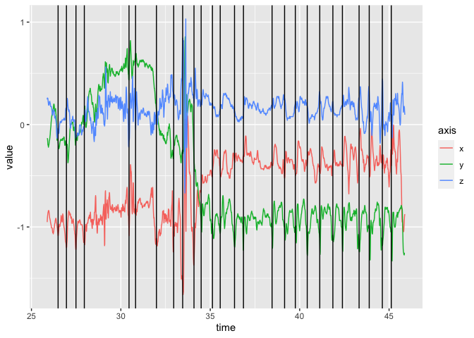 #> 6 2019-07-22 14:36:30.8233We can plot a portion of the tri-axial data and show where the steps were indicated: